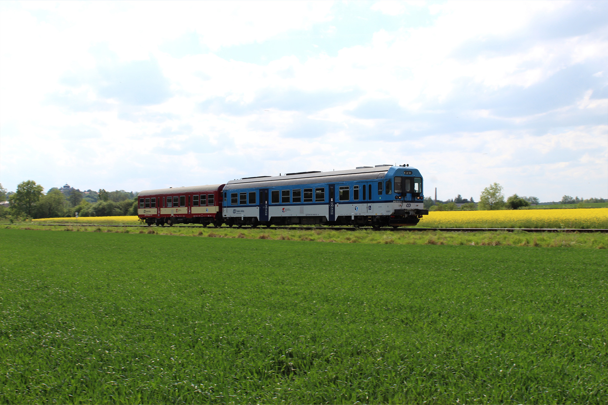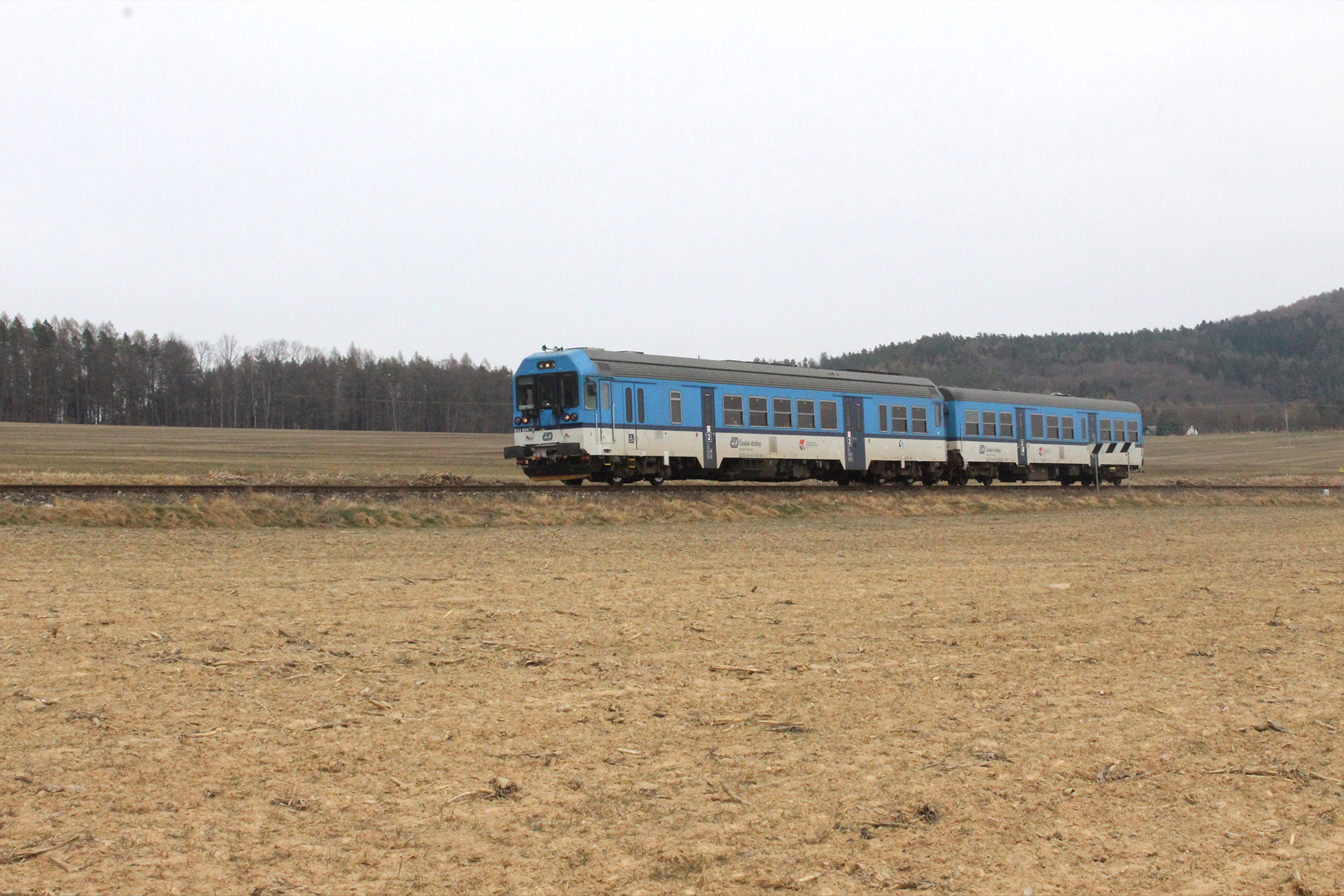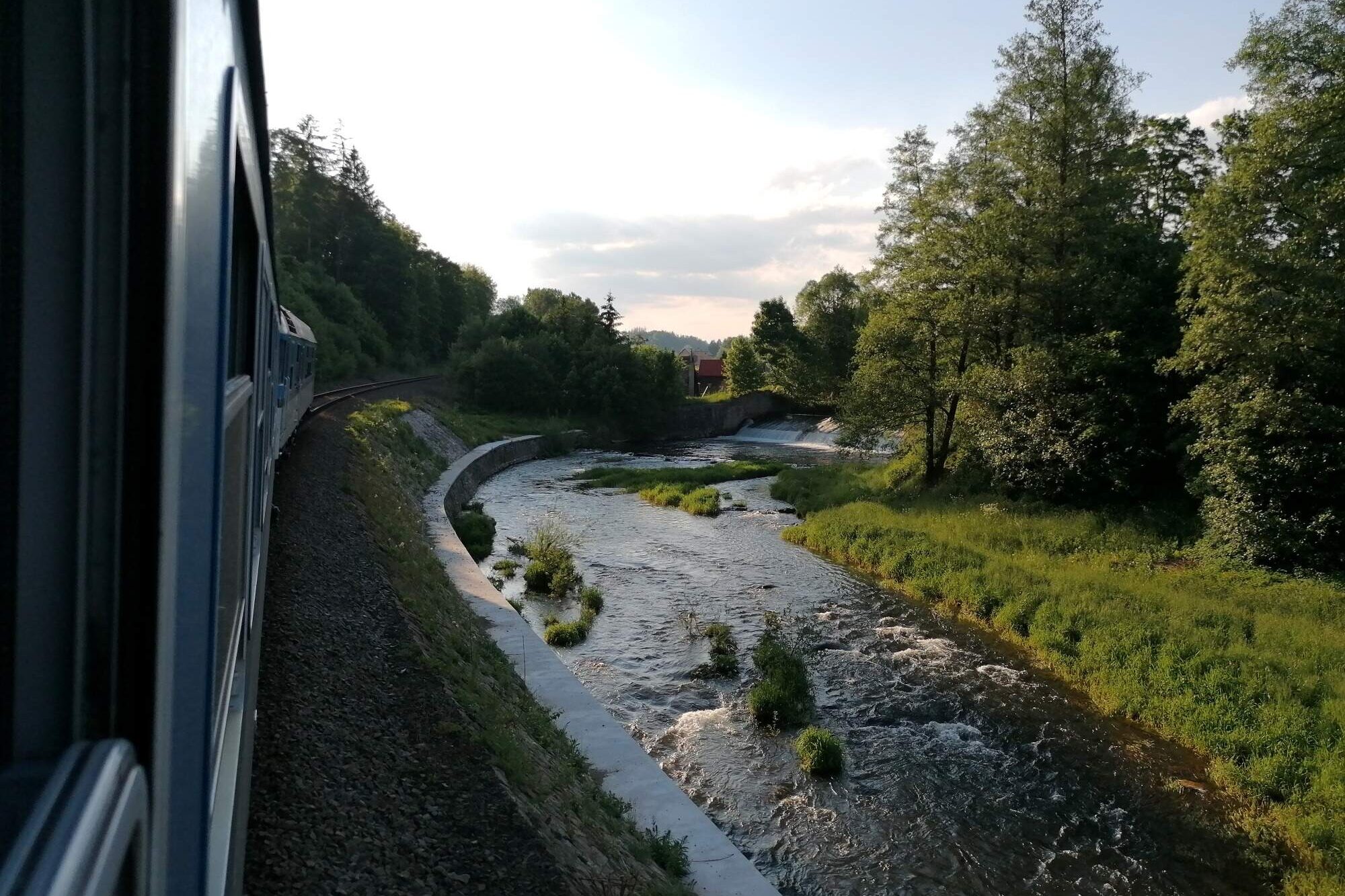 Když se vlak rozjede z Chlumce, krajina je ještě klidná, otevřená, skoro ospalá. Koleje se jemně vinou mezi poli, ale jakmile se blížíte k Ostroměři, začíná se scenérie proměňovat. Kopce se zvedají, horizont se láme a železnice vás nenápadně vede dál, hlouběji do podhůří.